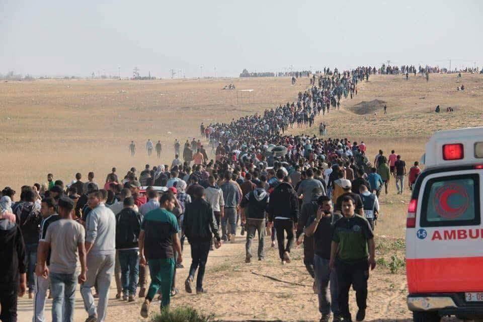 ويشارك آلاف المواطنين في مسيرات سلمية بدأت منذ ساعات الصباح في المناطق الحدودية، تزامناً مع نقل السفارة الأمريكية من تل أبيب إلى القدس المحتلة، وإحياءً للذكرى السبعين للنكبة التي حلت بشعبنا.