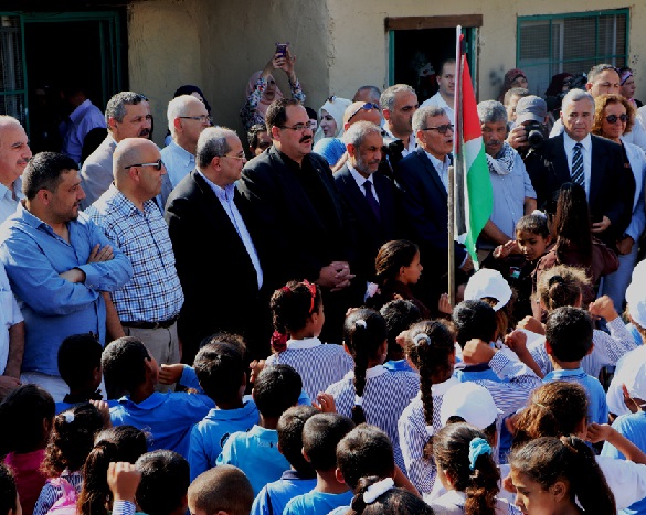 174 طالبا وقفوا في طابور صباحي وهتفوا "فلسطين حرة عربية، والقدس فلسطينية" وعلى وقع النشيد الوطني الفلسطيني "فدائي.. فدائي" افتتح العام الدراسي، بحضور وزير التربية والتعليم صبري صيدم، وعدد من المسؤولين وفصائل العمل الوطني.